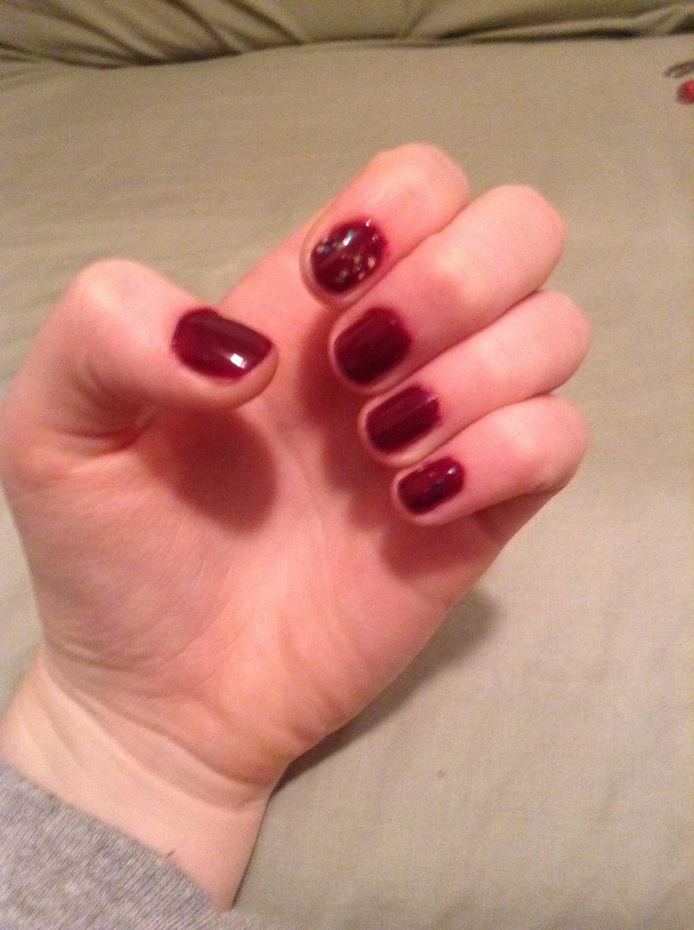 Add accent color (in this case, sparkles) to 1-2 nails. Most popular are pinky and pointer fingers. Pictured: Essie Brand in "Jazzy Jubilant"