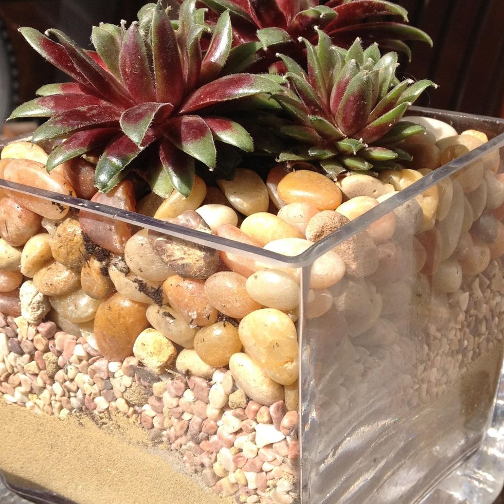 Anyway, it's still easy to start from scratch. Collect a square glass vase, and 3 sizes of stones: sand, small rocks, and slightly larger pebbles. These will be layered to give a gradient effect.