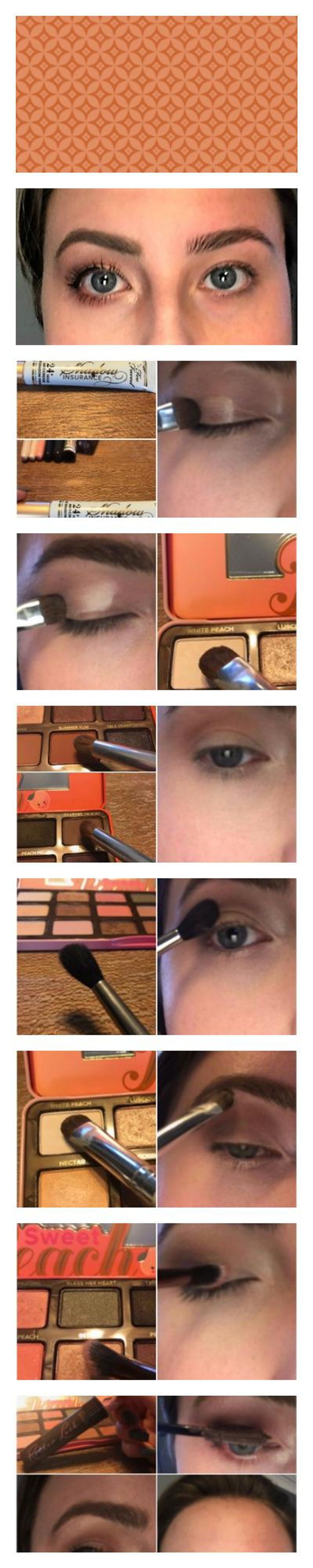 Add "JUST PEACHY" under the eye with a brush. Apply mascara and eyeliner. Then apply "NECTAR" to the inner corner. Finish with setting spray.