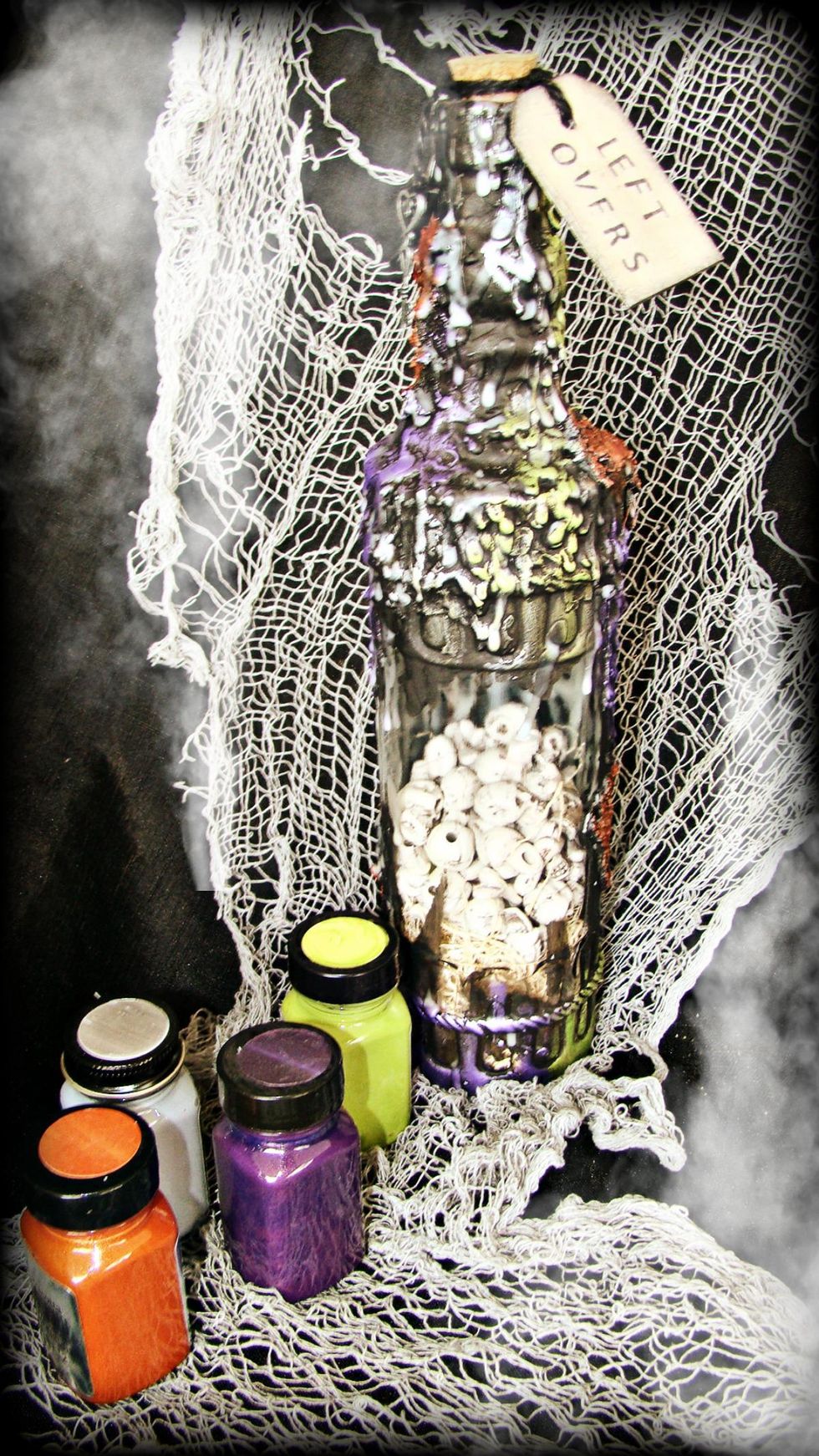 For added texture mix AA's Mud with black gesso and mix in some craft sand (purchased at $1.00 store) and put in globs here and there on bottle. Allow to dry.