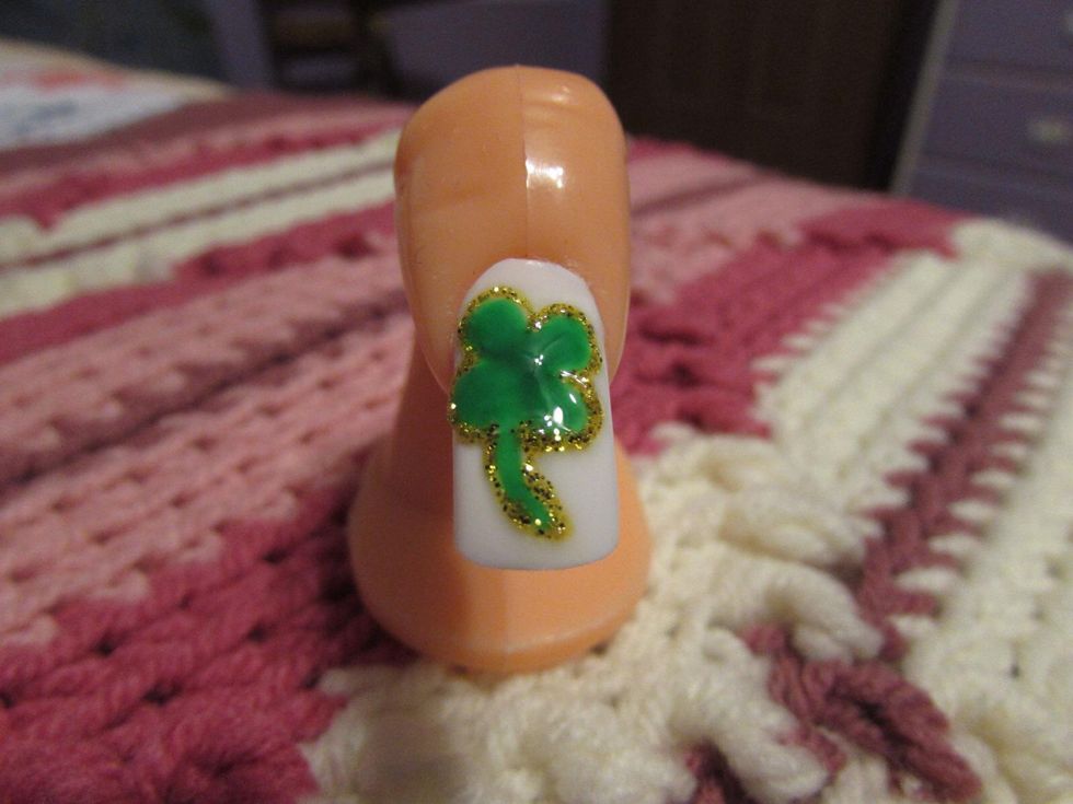Ok so the first step is to put on the base coat and then your white base color. Now dab some green down so we can start the four leaf clover!! Good luck!