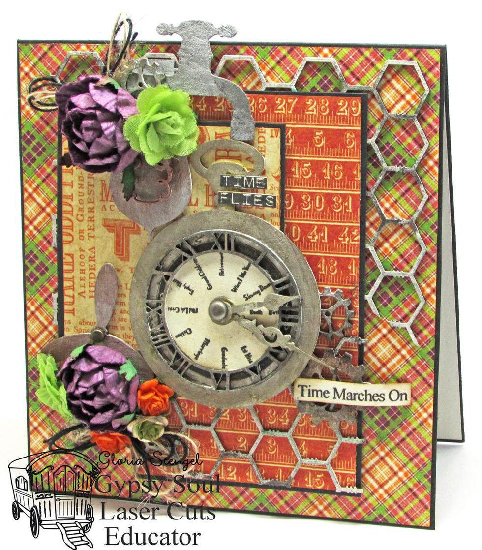 Add more steampunk embellishments to the card, around the edges of the pocket watch. Place the Time Flies and Time Marches On sentiments as shown.