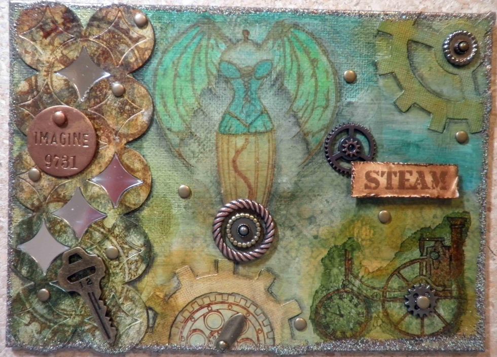 Stamp "STEAM" onto smooth white card stock with StazOn Spiced Chai. Cut out, distress edges, color with a brown distress ink, adhere with foam dots.