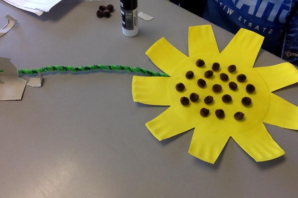 flip your plate over, take a piece of tape , and tape your pipe cleaner to the back of your flower