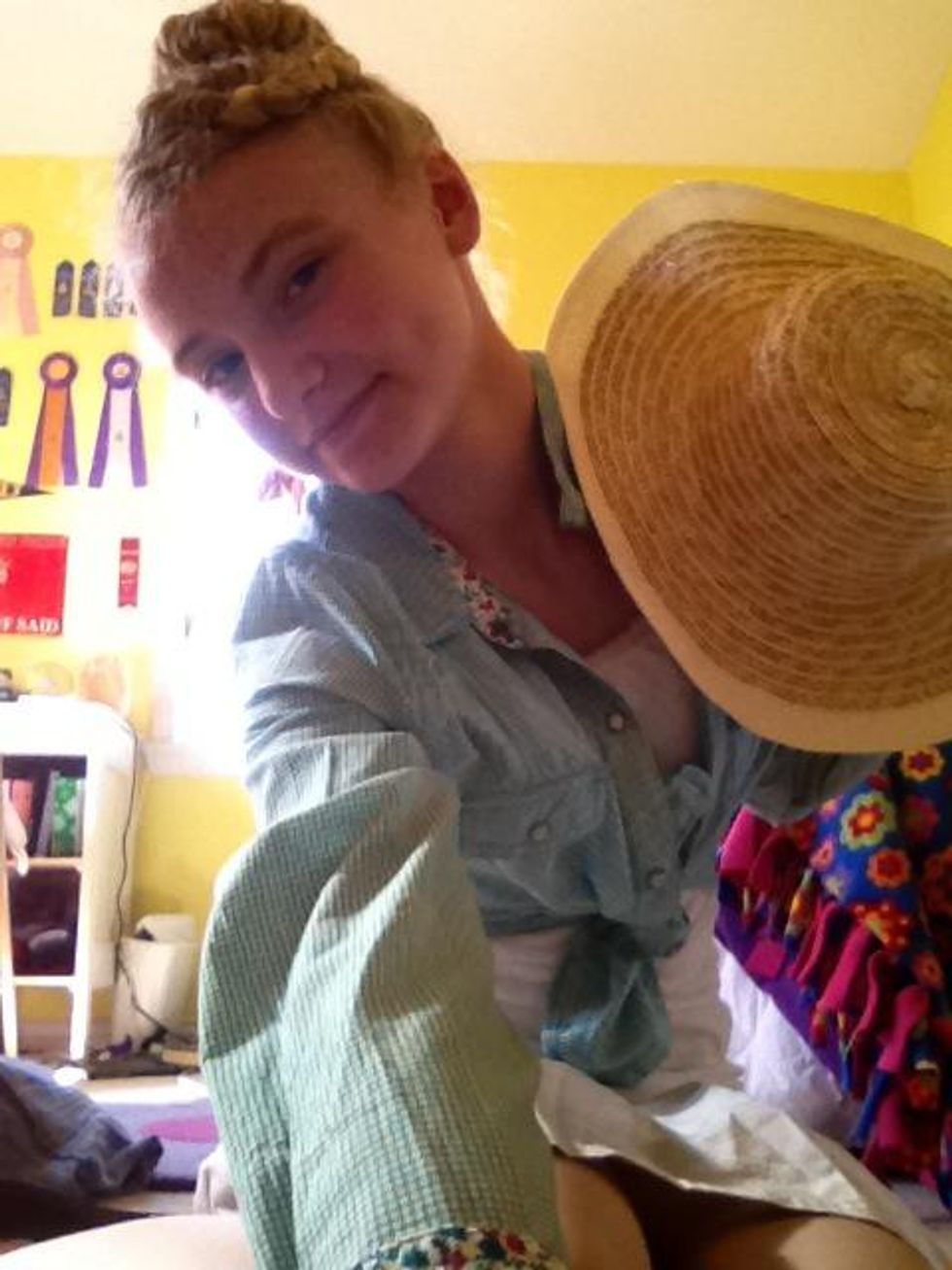 So first I took the ugly green shirt and put a cute white tank under it. Then I tied it up and look how cute that is!:) you can do this with any ugly western shirt or cut a long shirt down the middle.