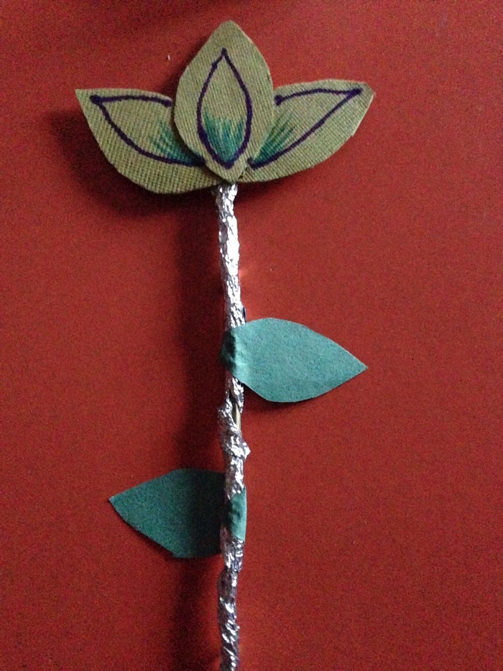 U will need glue , 1 hard paper of any colour , scissors , sketch pen garden stick , one green colour paper and a foil paper
