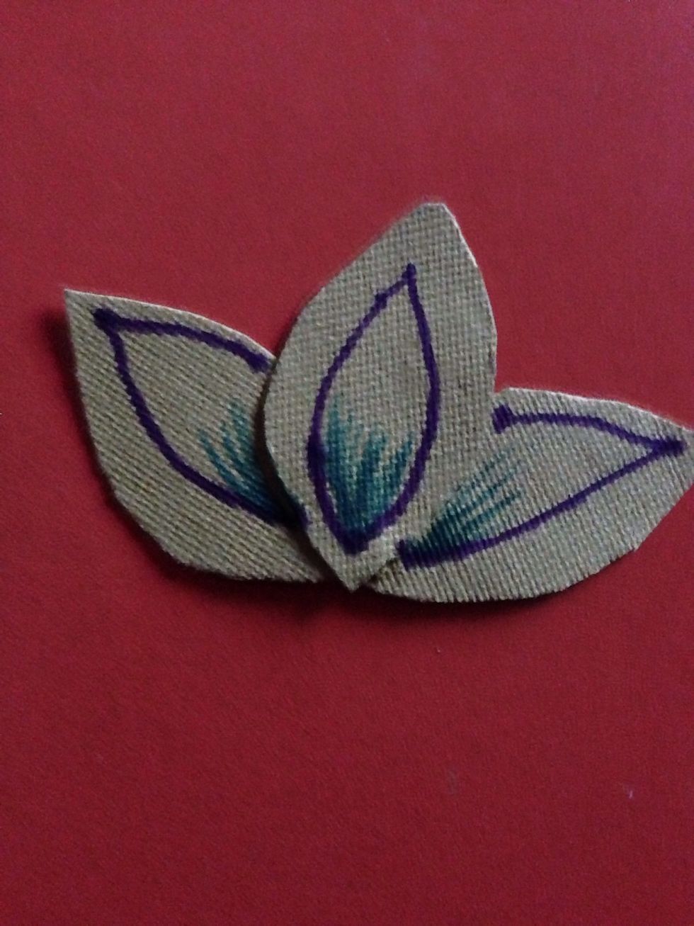 Take a colour and cut 1 leave . Cut two leaves exactly the same as the first one . Stick them as shown