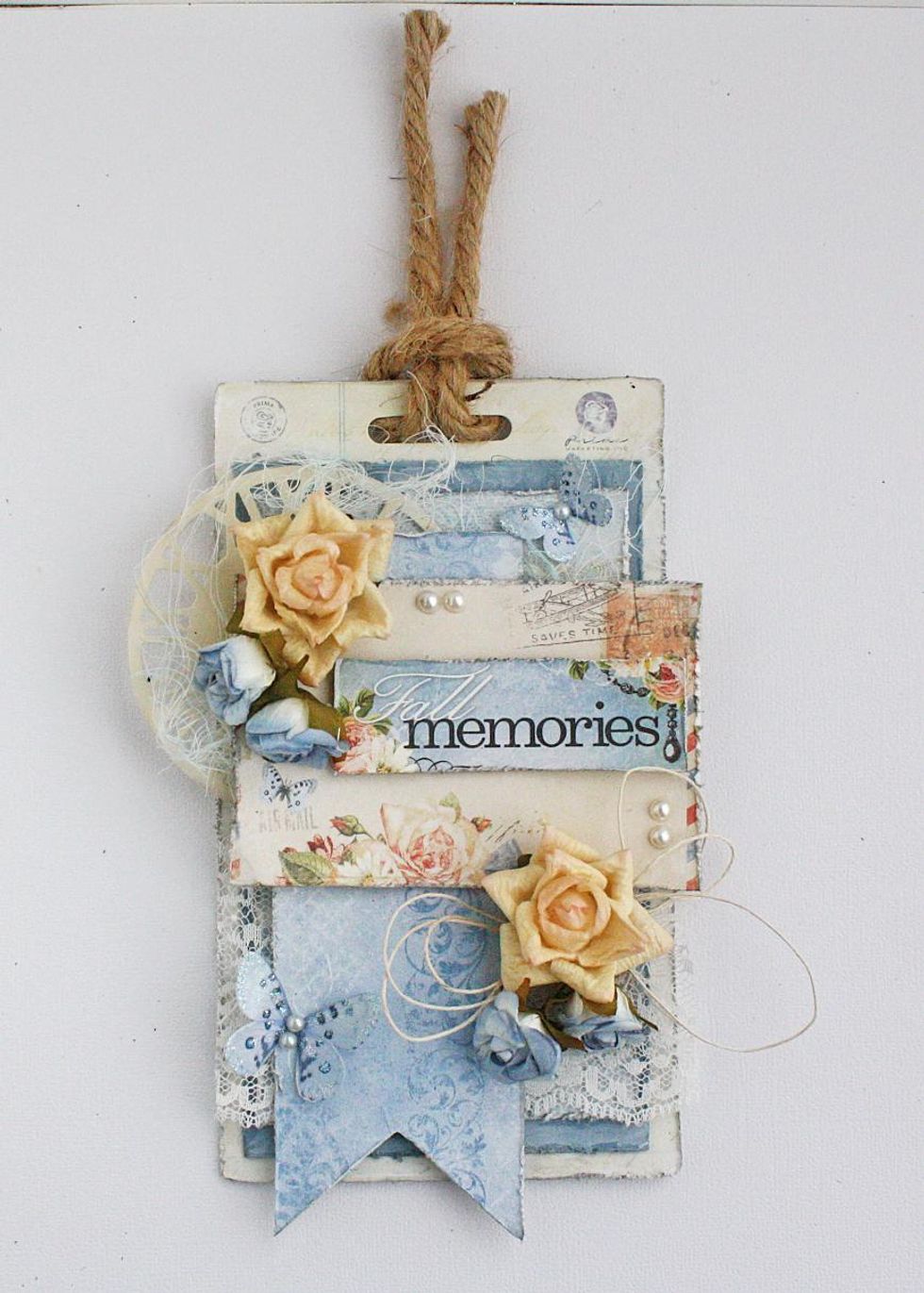 Gather Supplies. I used Prima Packaging as the base of my tag. Trim papers: Blue Cardstock 3.5x6, Blue Lace Paper 3.25x5.5, Banner 6x2.25, Blue Fern Studio Journaling Spot and Fall Memory Title