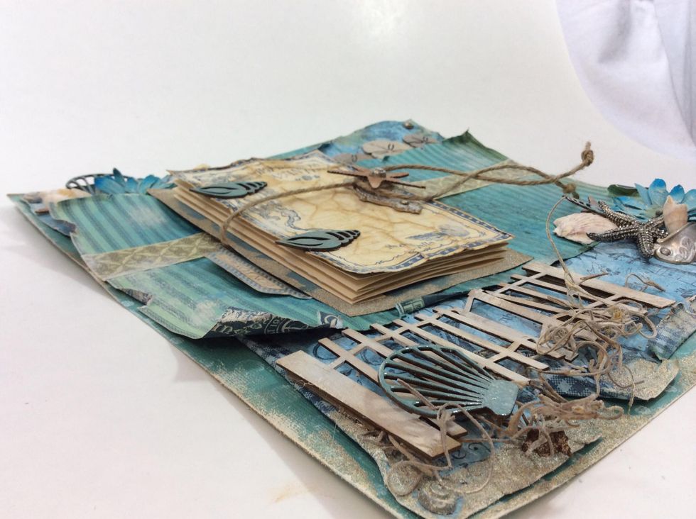 Above accordion piece, in the upper left corner area, adhere a collage of sea treasures and beach phrase cut aparts.