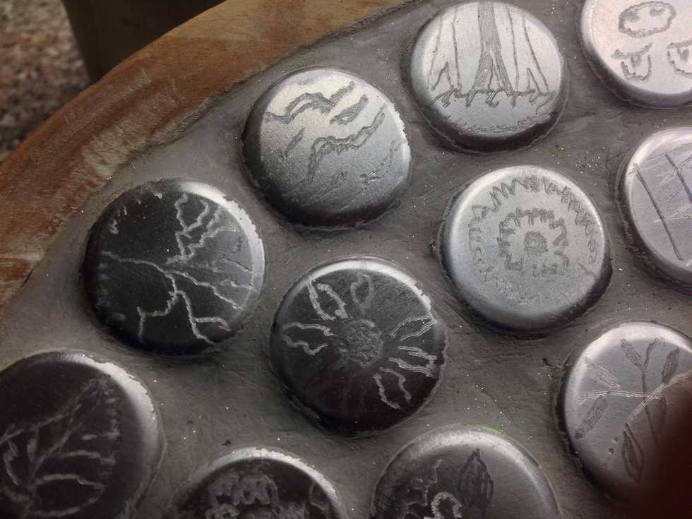 Bottle caps were sanded out and creative designs were engraved with a dremel