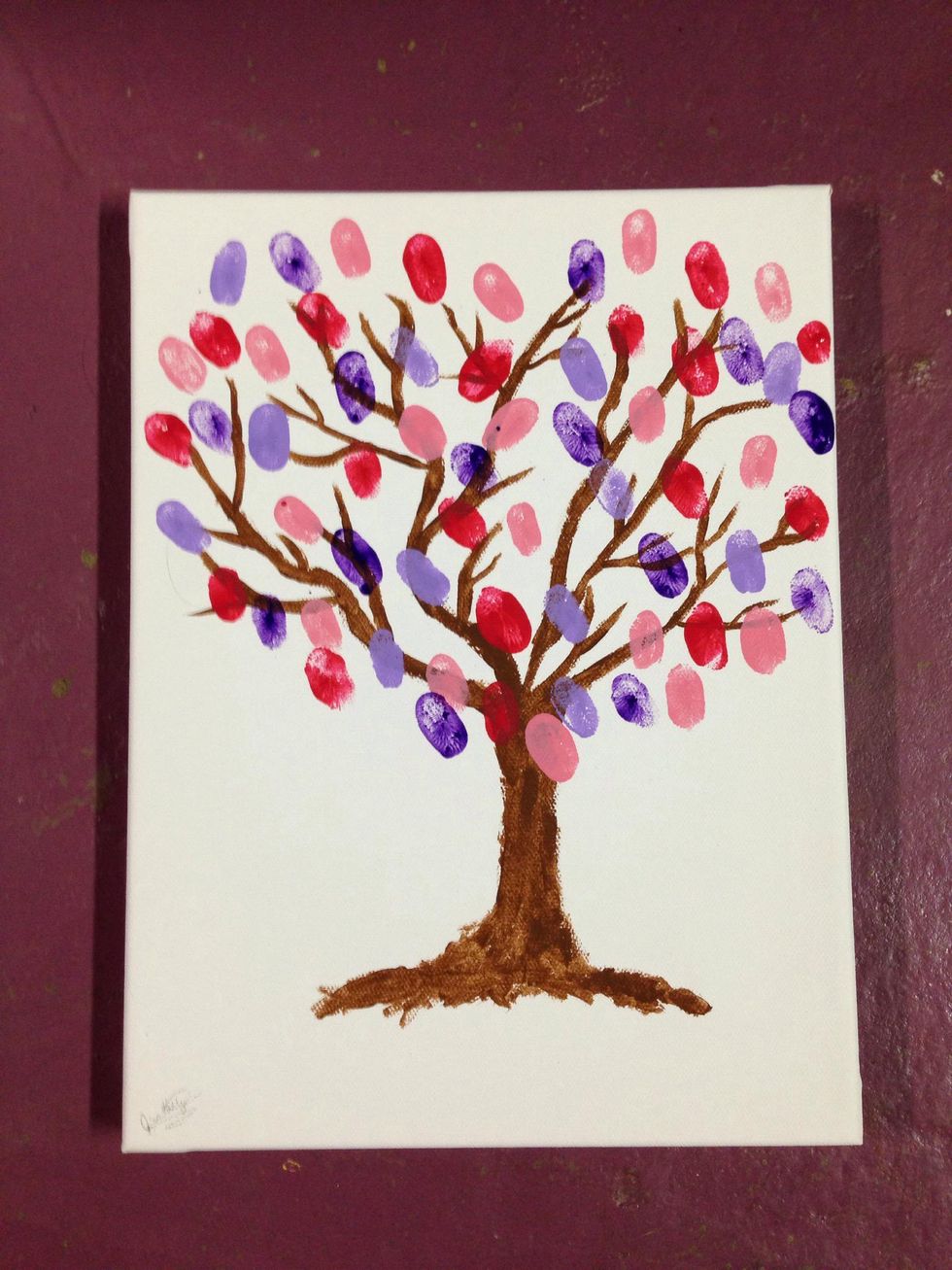 Tap around the tree in the lighter colors then go to the darker. Put the fingerprints in a heart shape on the tree. Wipe off the paint when you move to a different color on a cloth.