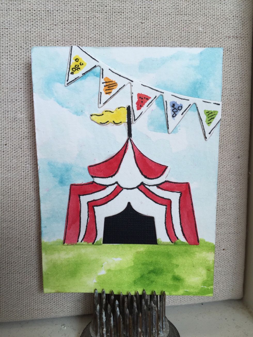 Paint your tent. The cool thing about the Spellbinders dies is that on the watercolor paper they will be embossed! Your stripes are already marked for you!