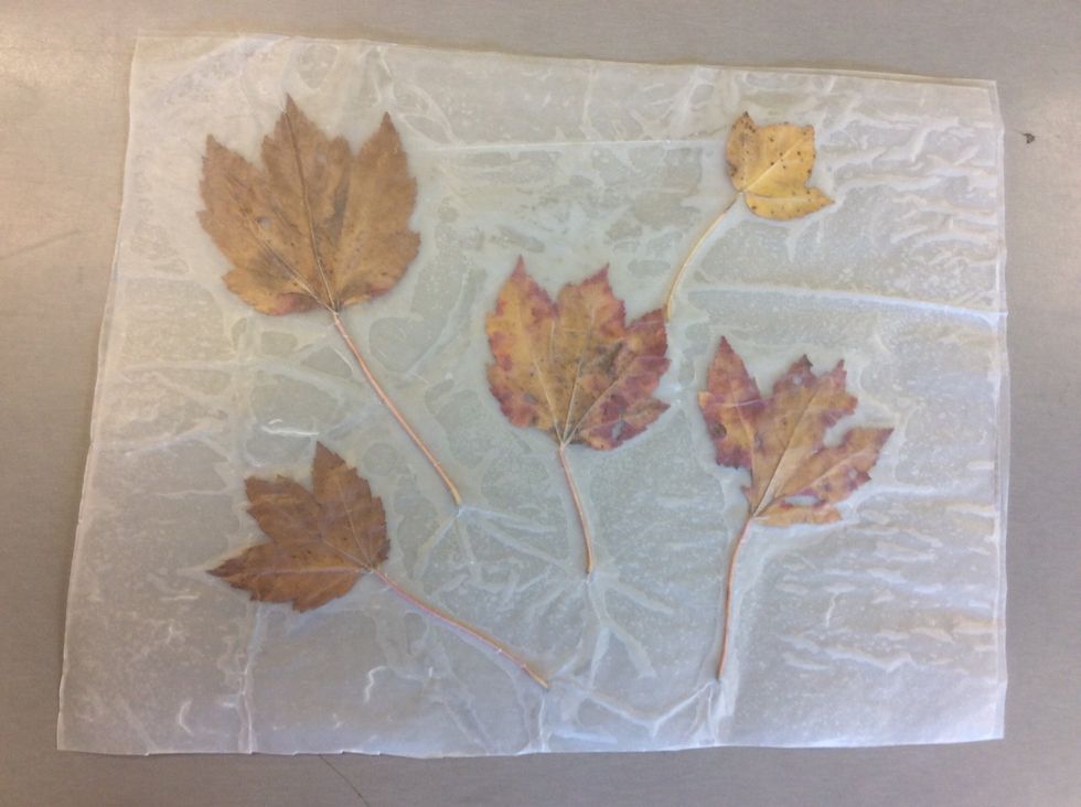 2- Put the other half of wax paper on top of the leaves making kind of a sandwich