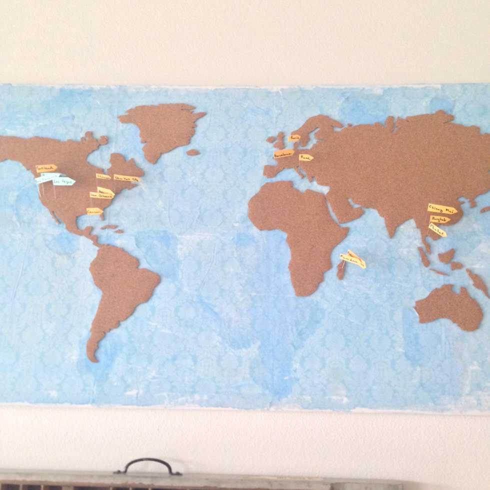 Find a map you like (don't pick something that's super detailed) and print out a large version of the map using the website blockposters.com. Then tape it together and place it over the cork.