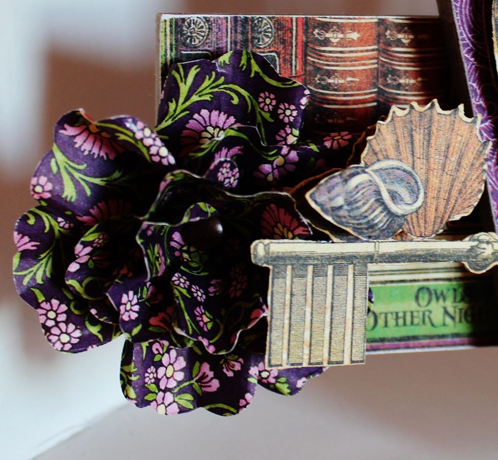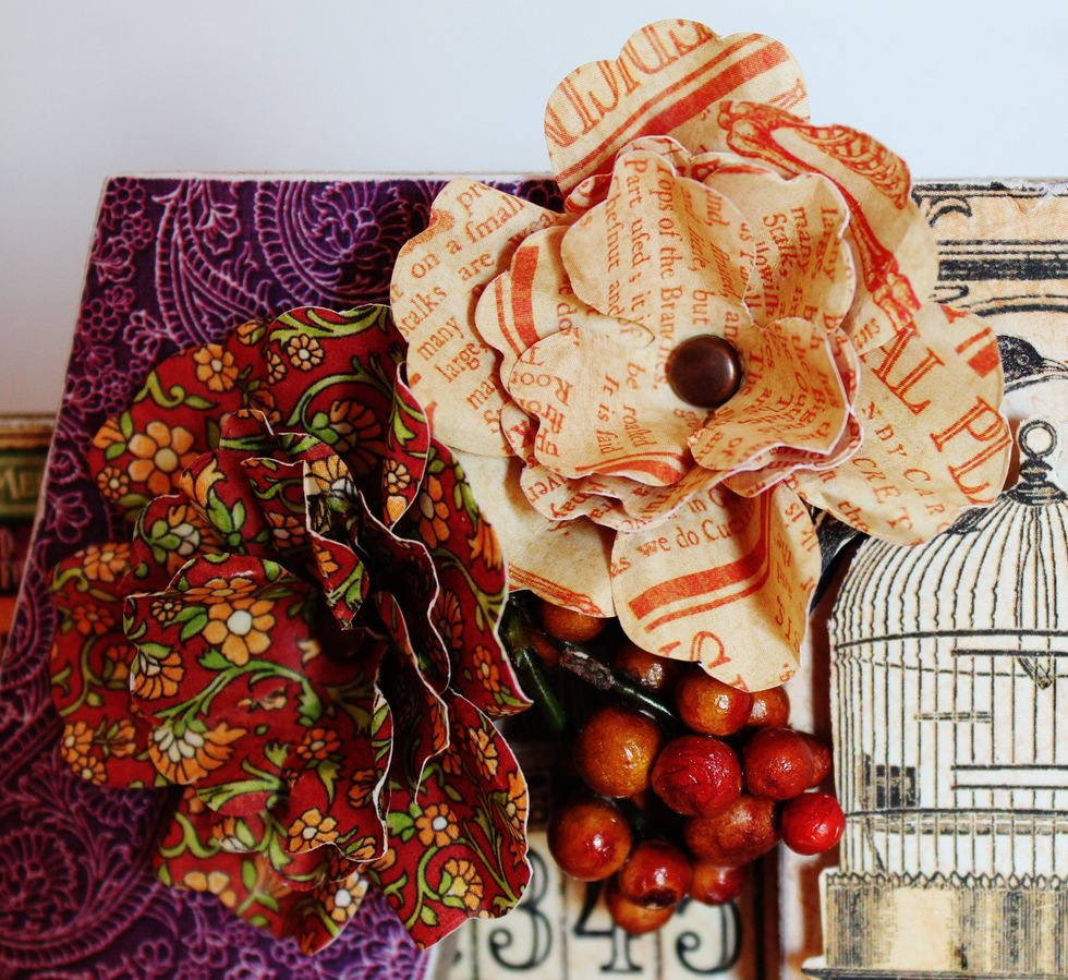 Die cut and create flowers using the Pansy Die. Shape petals with tweezers, place together using brad.
