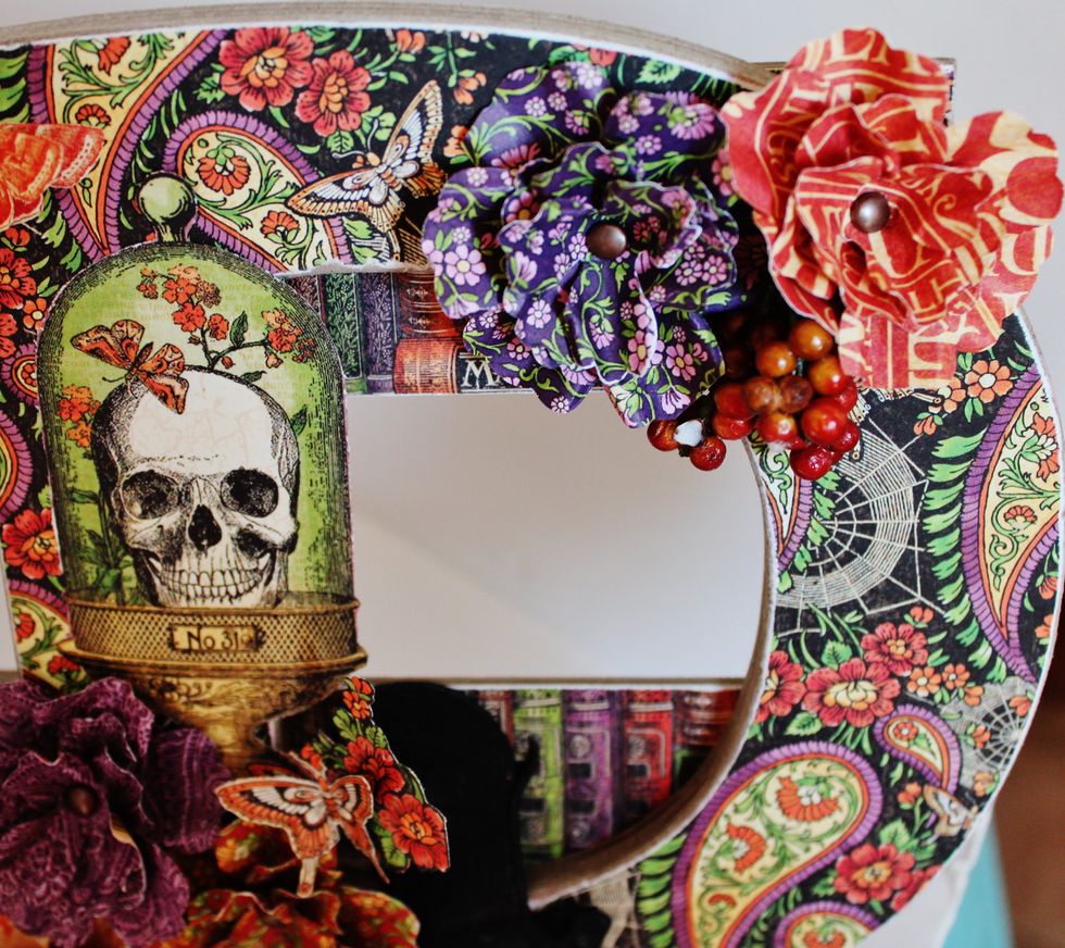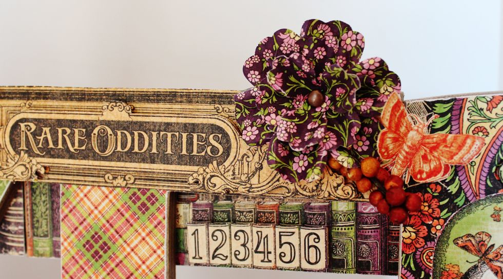 Place frame of a journal block from the Rare Oddities pattern paper. Adhere to sign.