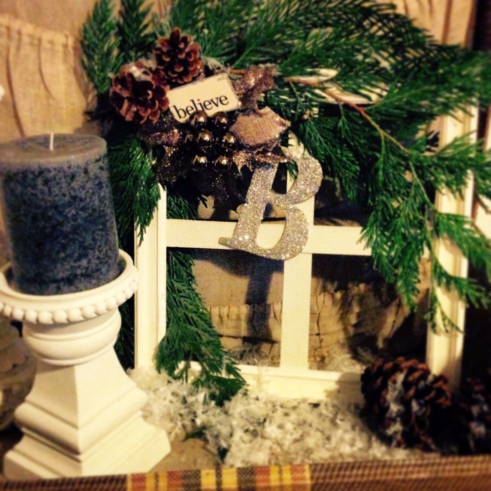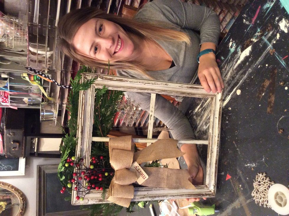 Once your window is distressed to your liking, place frame face down and arrange cedar clippings in the top right corner. Using hot glue, adhere to the backside of window.
