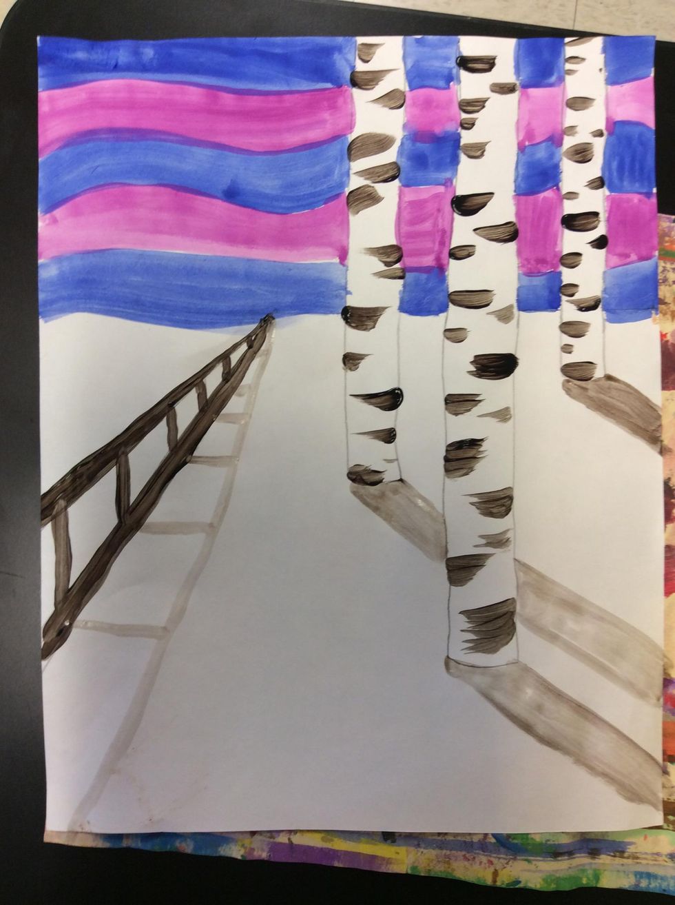 Using cool colors, paint stripes in the sky area. Be careful not to paint the trees!