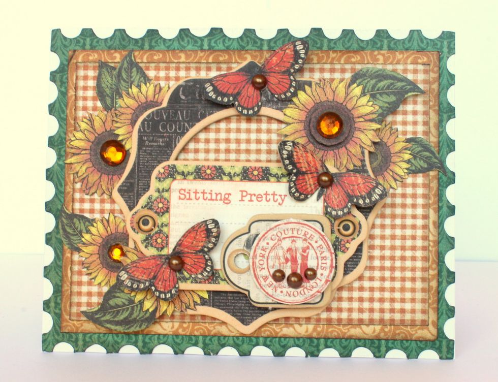Cut out four sunflowers from one of the papers in the Graphic 45 French Country 8" Pad and attach them to your card in the way shown in this photo.