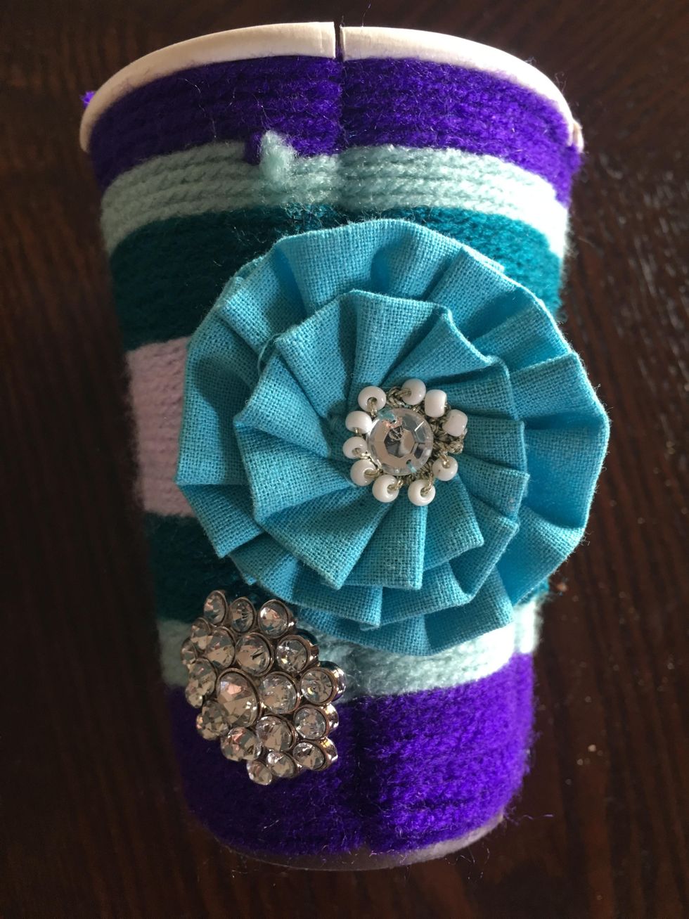 Begin the weaving by following an over under pattern around the cup. Do not pull the yarn to tight.