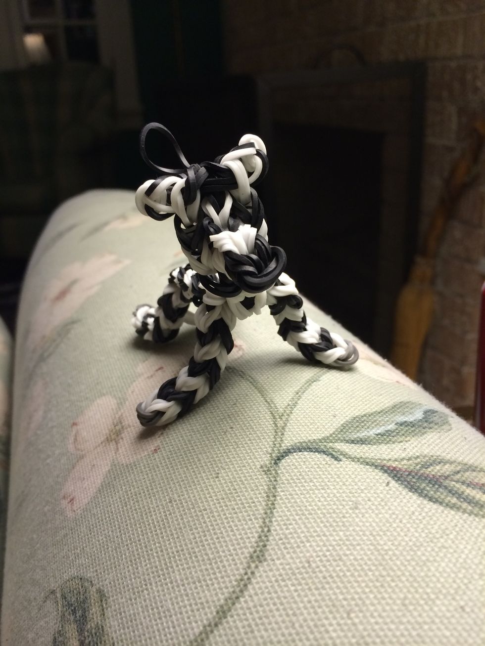 Place two separate sets of 1 white and black band. These are going to be our ears.
