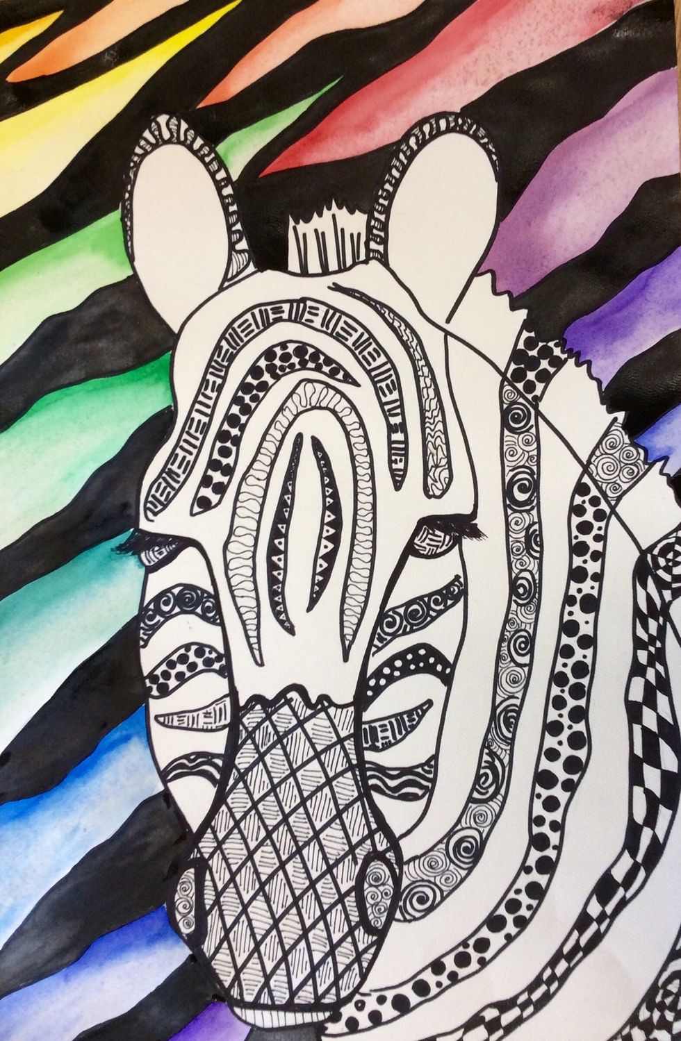 First, Use a pencil to add a variety of patterns to the black areas of your animal. Next, use black permanent marker to fill in your patterns.