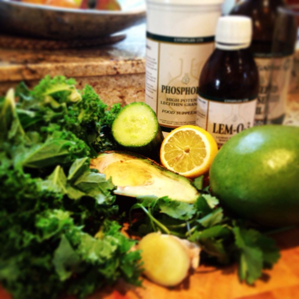 Add 2 large handfuls of Curley kale and the lump of ginger. Add a sprinkling of lecithin granules to help emulsify the good fats in the avocado and give it a creamy taste (optional).