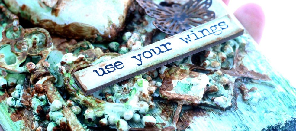 Using Gel Medium adhere your embellishments. I started with the chipboard on the bottom piece, then added my items on top. I used gel medium to add art stones for added texture and dimension