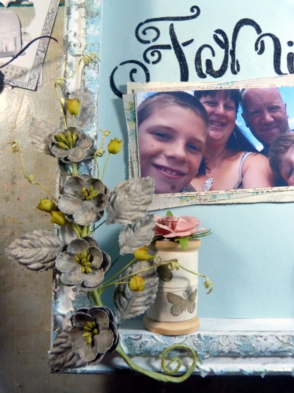 Layer up your photo with 2 pieces of distressed pattered paper from the main kit, making the layers slightly wonky. Fix onto box.