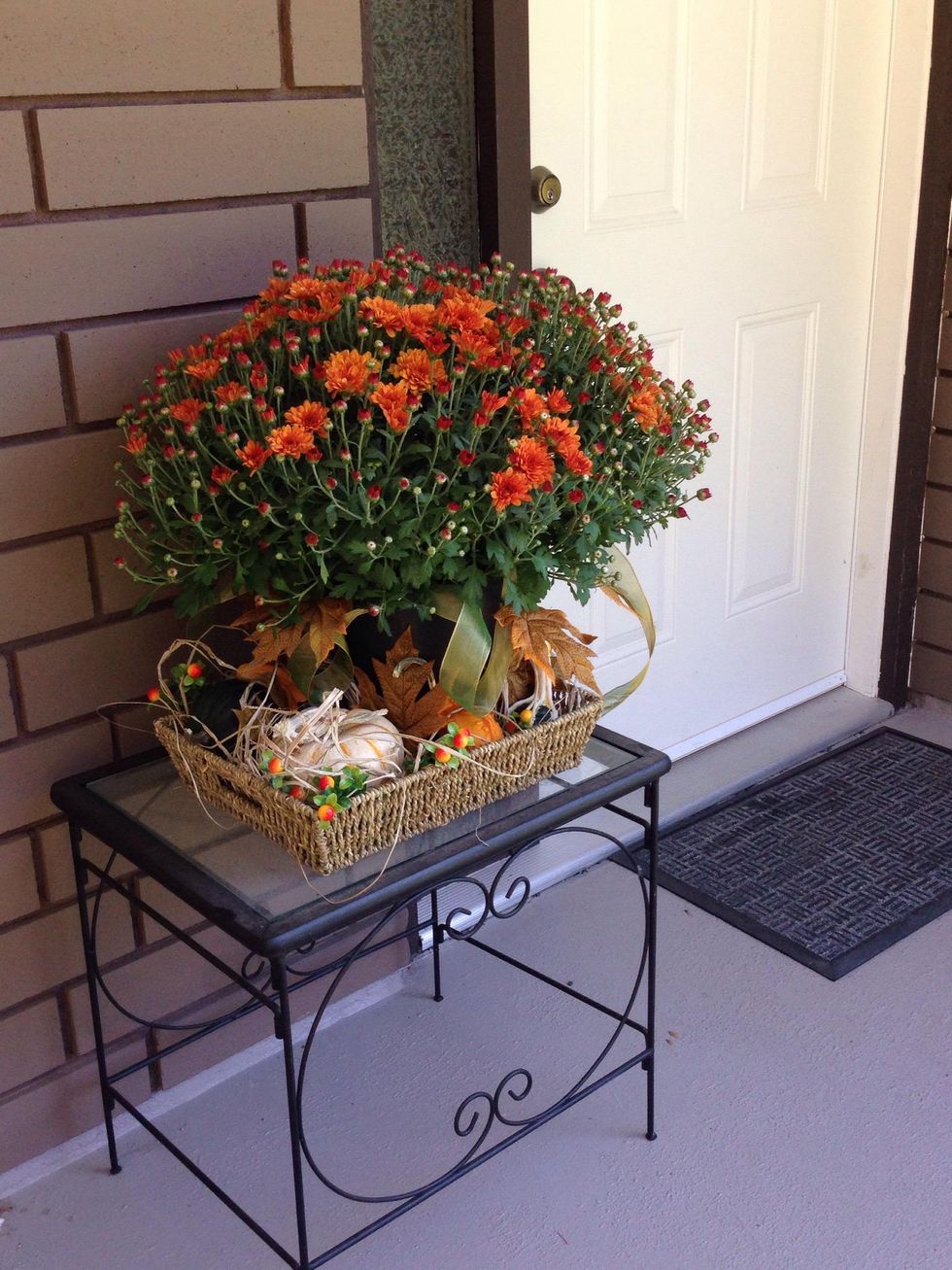 Make a hole in the raffia in one corner, and in it place the potted mum.