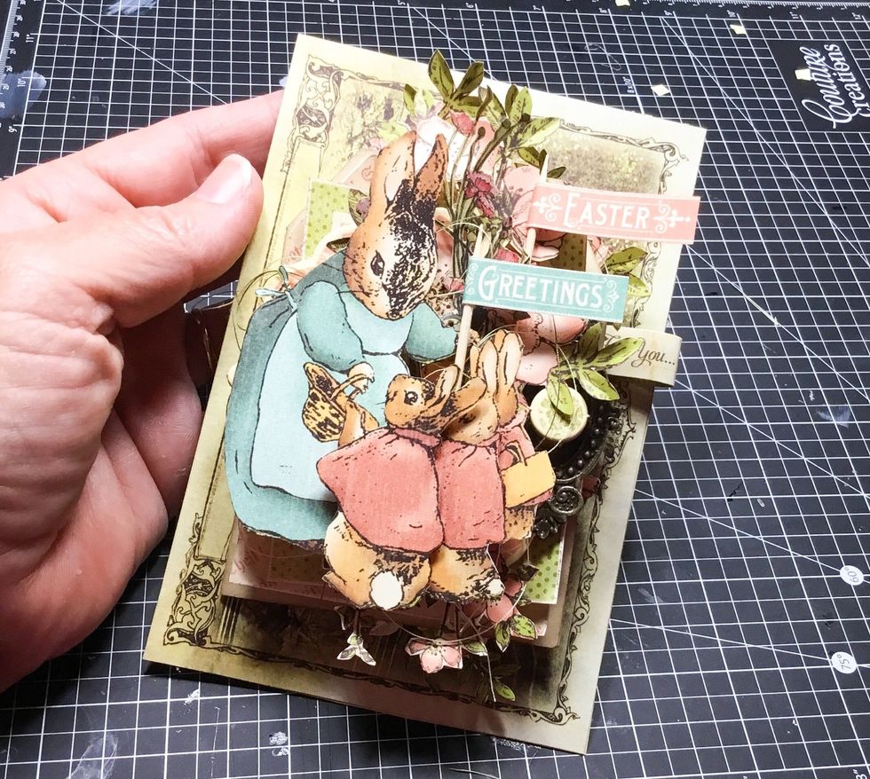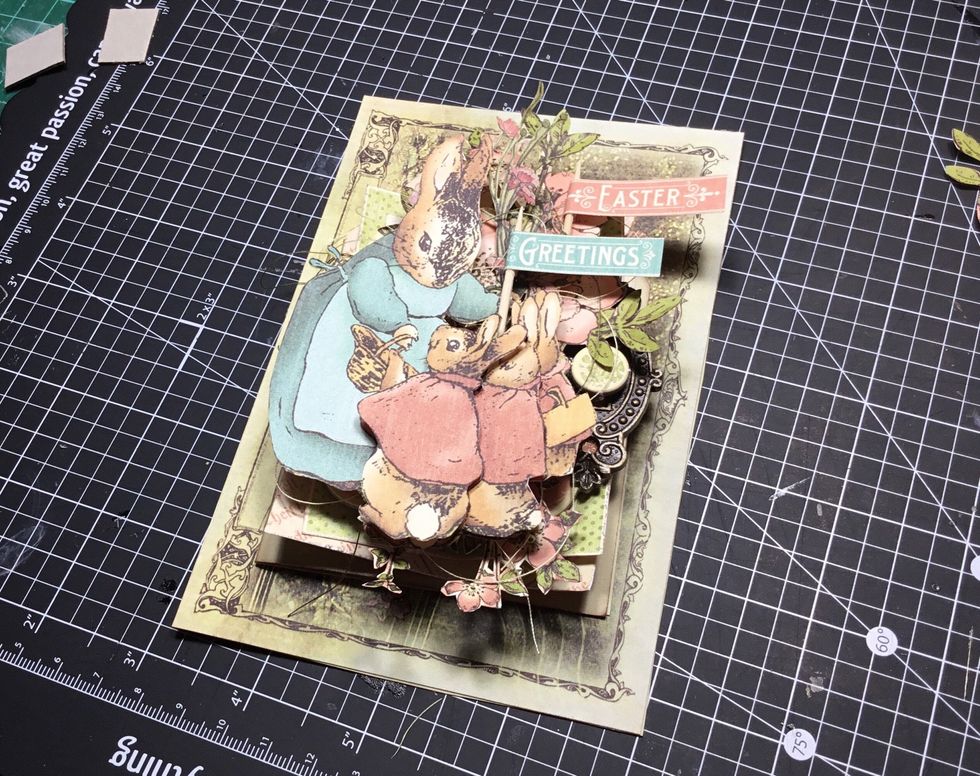 I somehow misplaced the steps for this part but basically layer more fussy cut flowers and a cute bunny.