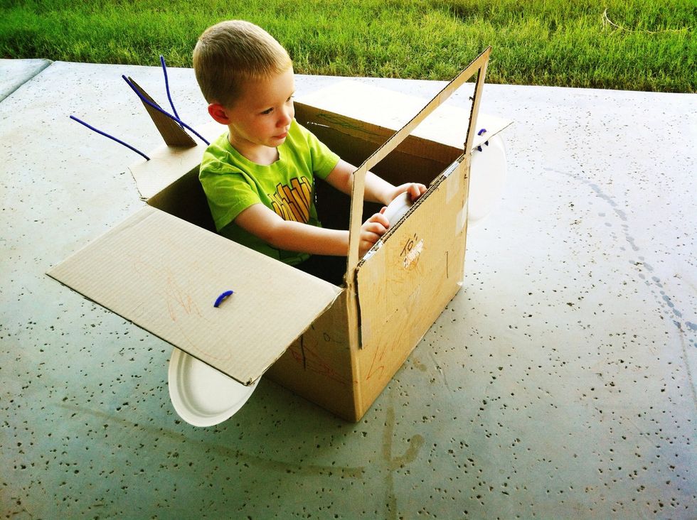 Cut the back tail flap, tapering it. Attach a paper plate steering wheel with a pipe cleaner.