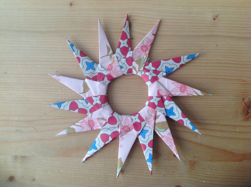Cut 14 squares of some origami paper. Mine was 9x9 cm (3,5x3,5 inches). It can be half of half, all colors mixed or all the same color/paper.