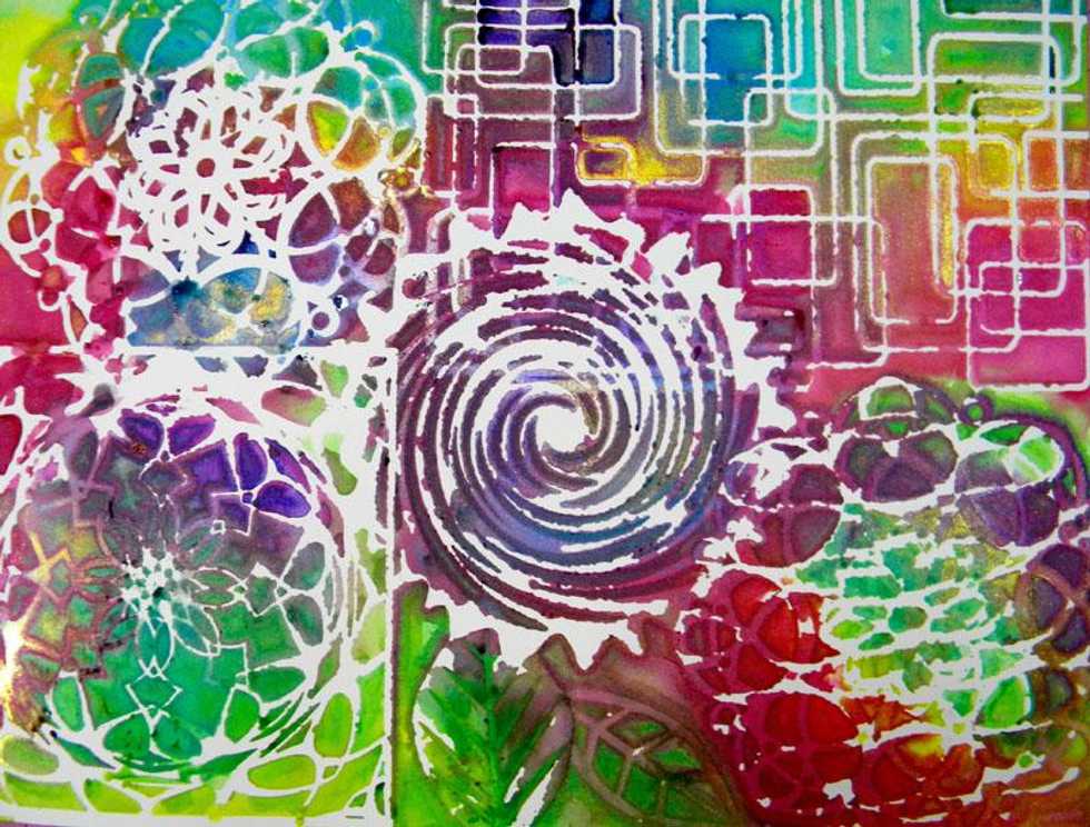 Place a large piece of mixed media paper onto a mat and cover it with various Art Anthology masks. I chose masks with no boarder so that the whole design will show with no sharp boarder lines.