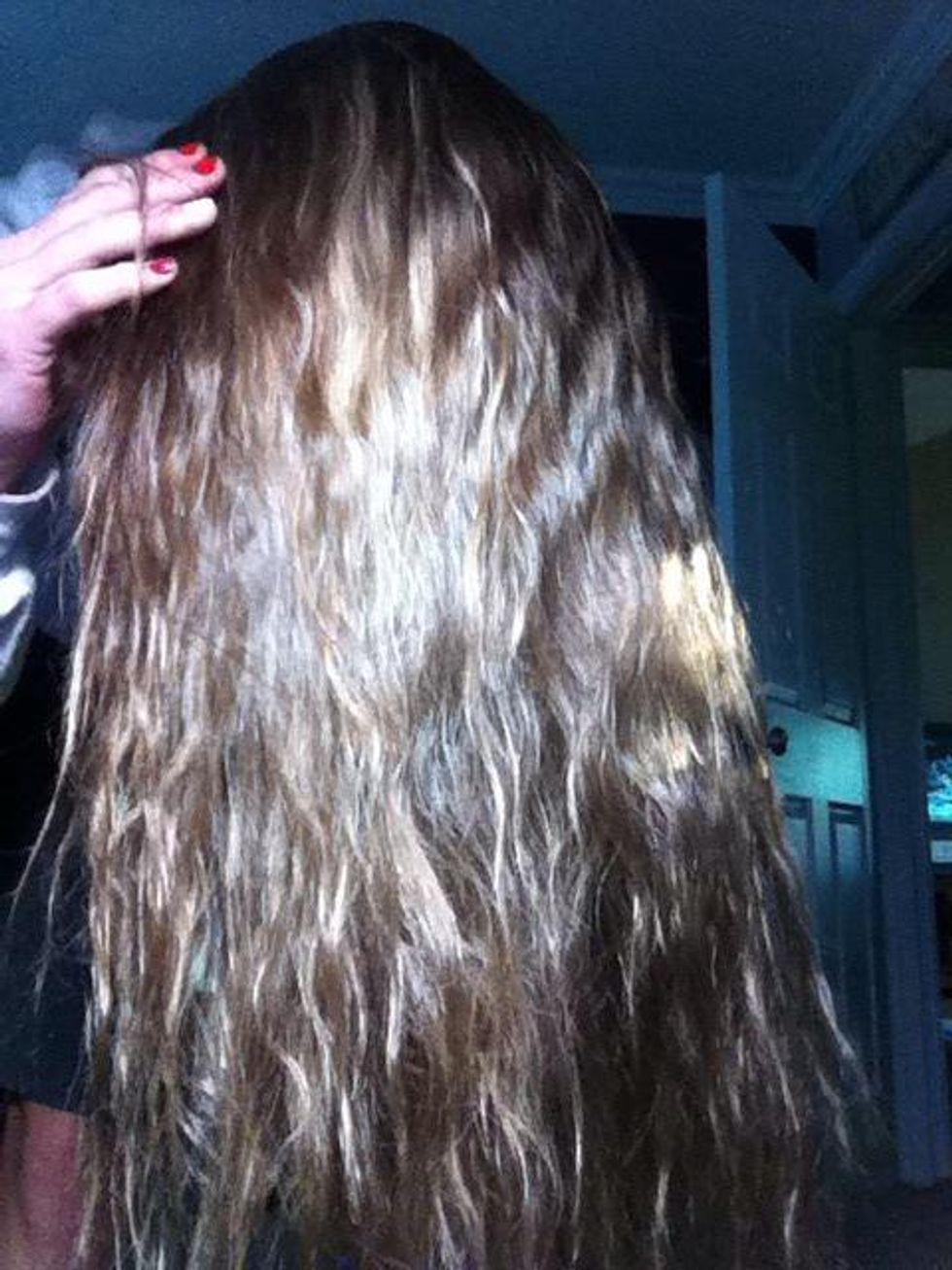 Take a pea sized amount of your curling gel and rub it through out your hair. (This is what creates the beachy wave look to hold in place) (The Pantene one is not sticky or crusty. Best one I've seen)