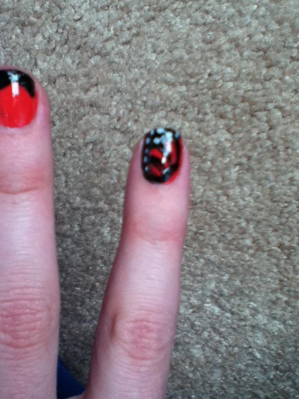 Now using a nail art pen or nail polish in white, add dots to the black part on top and on the sides of the nail, (sort of a poor job but u get the jist.)