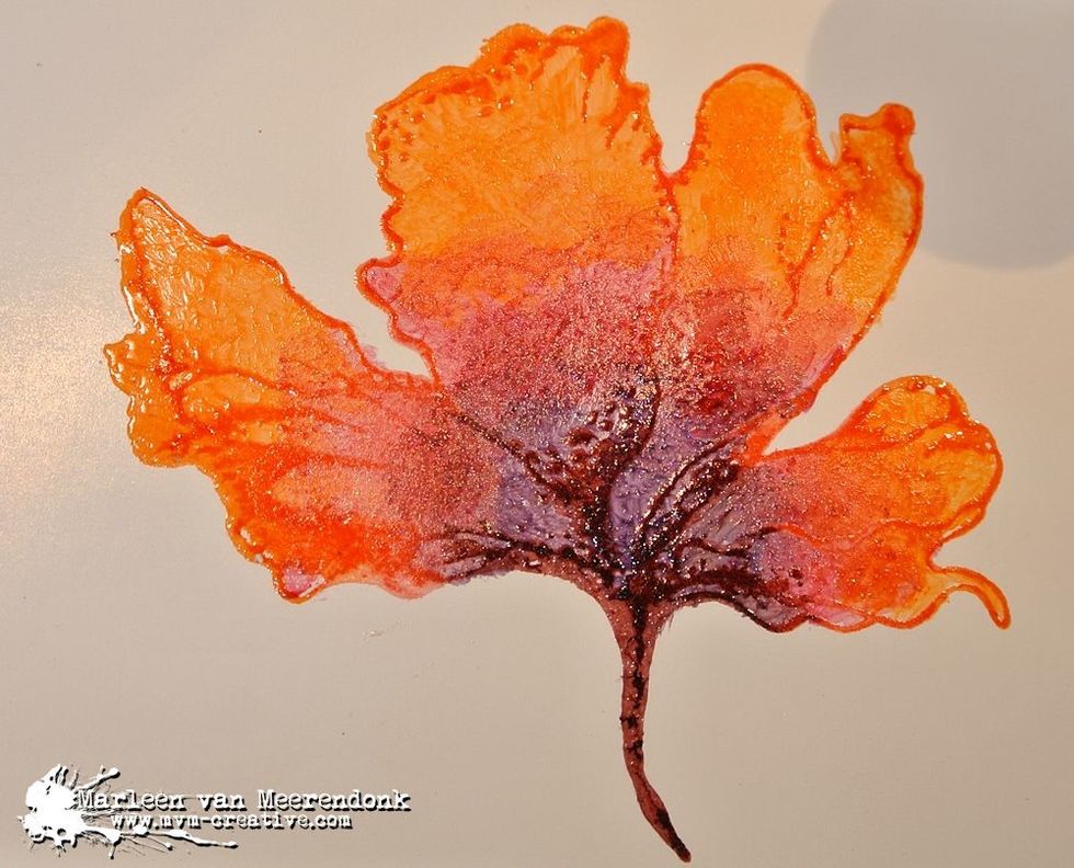 Stamp with 1 distress oxyde color and emboss with clear embossing powder. Color the flower the same way.