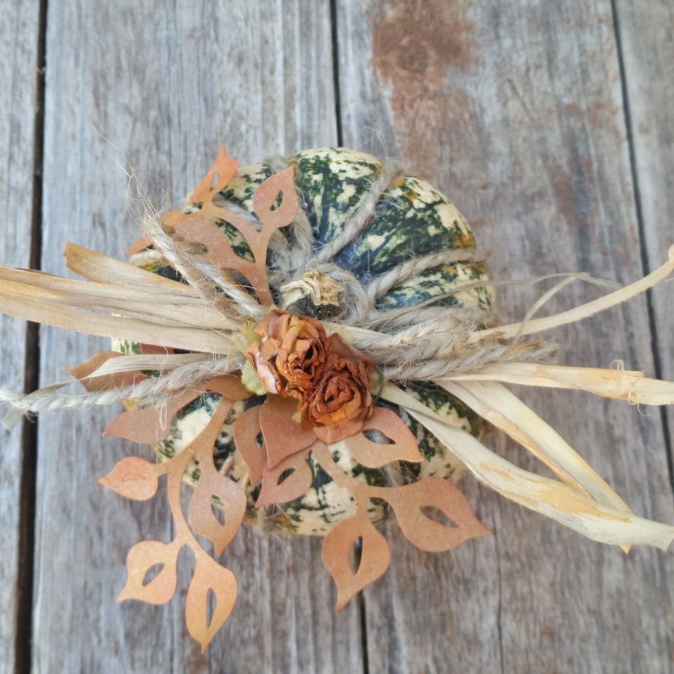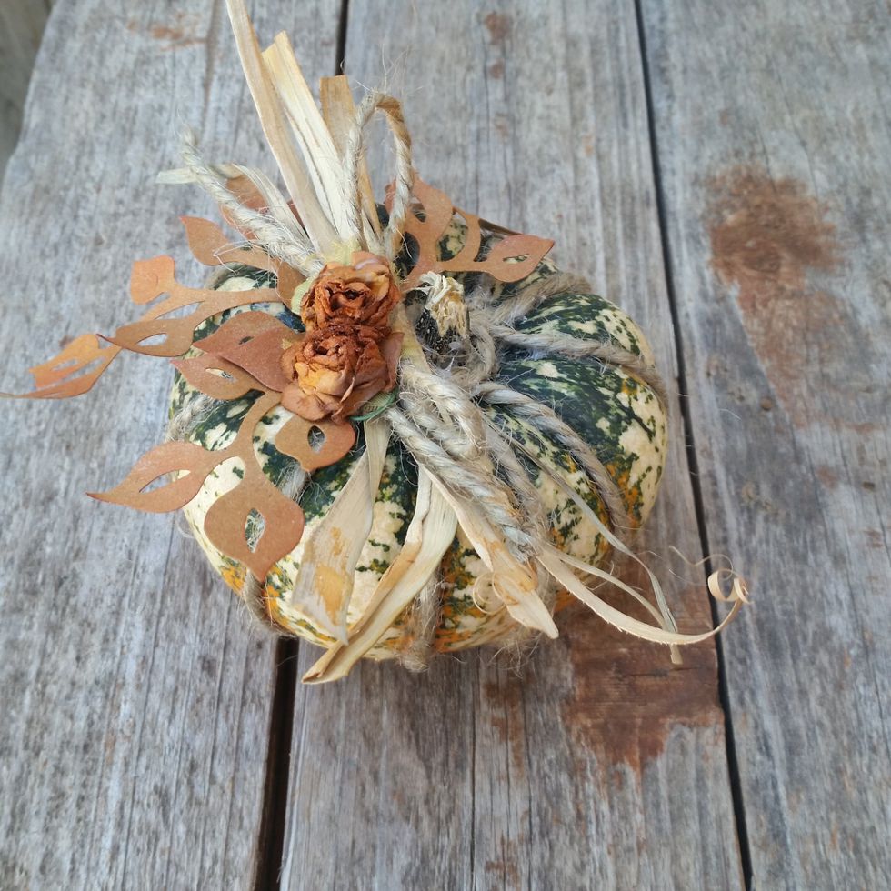 Here is a fun greenish pumpkin. I added extra ivy and raffia, but only 2 flowers to the top.