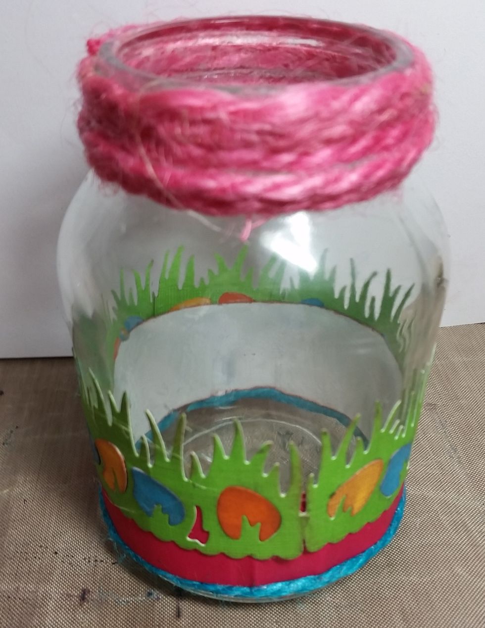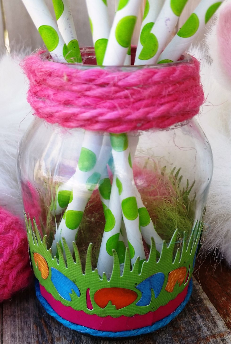 I used sections of the green and pink rope pulled apart as "grass" inside the jar.