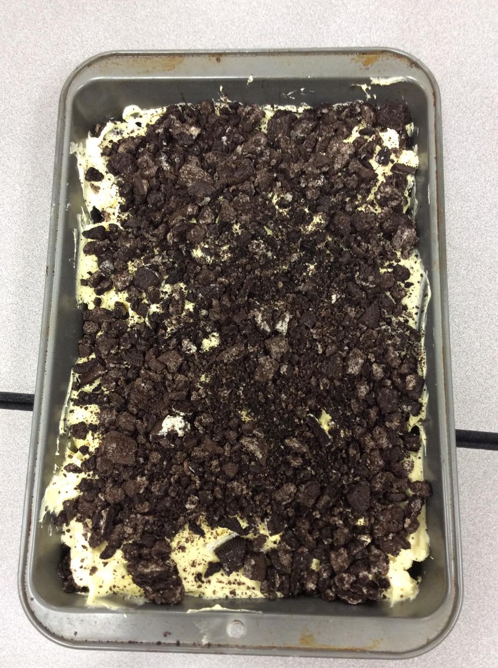 Then, you put layer the cake. First put Oreos then, the pudding mixture, lastly more oreos