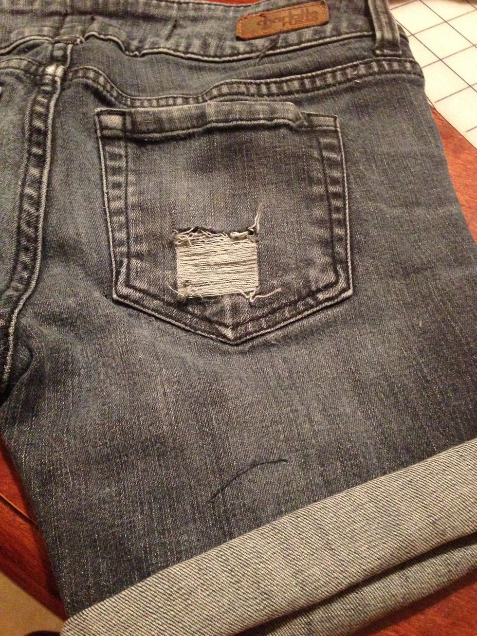 Put your cardboard in between were you are cutting and the rest of the denim. Now take your blade and cut where the lines are, a scissor blade works just fine!
