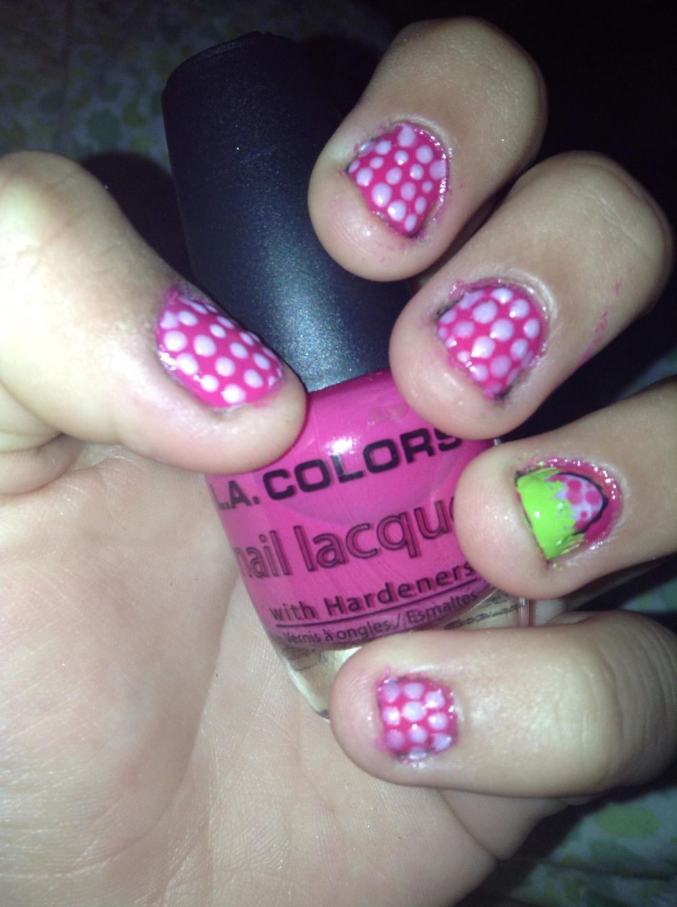 Put a base coat on then after that use a pin and with a different color dip the pin and make dots in rows or going diagonal
