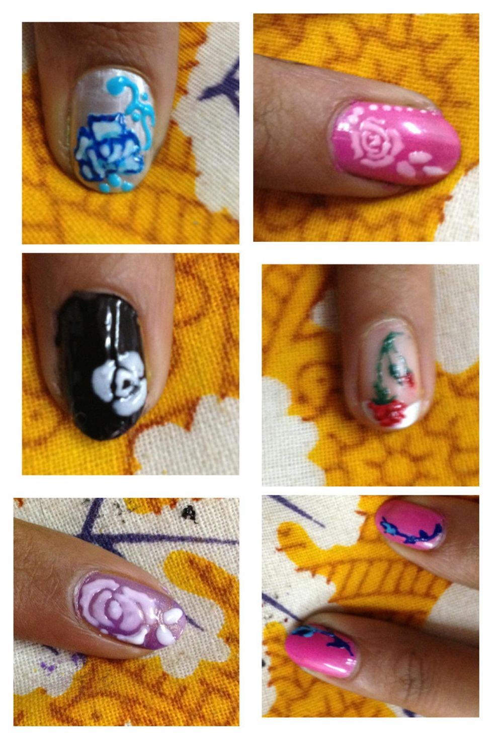 Pink base and white rose..as you can see the white takes a lil colour from the base and looks like baby pink..same trick..start with a dot keep makin fine lines around in a circular shape