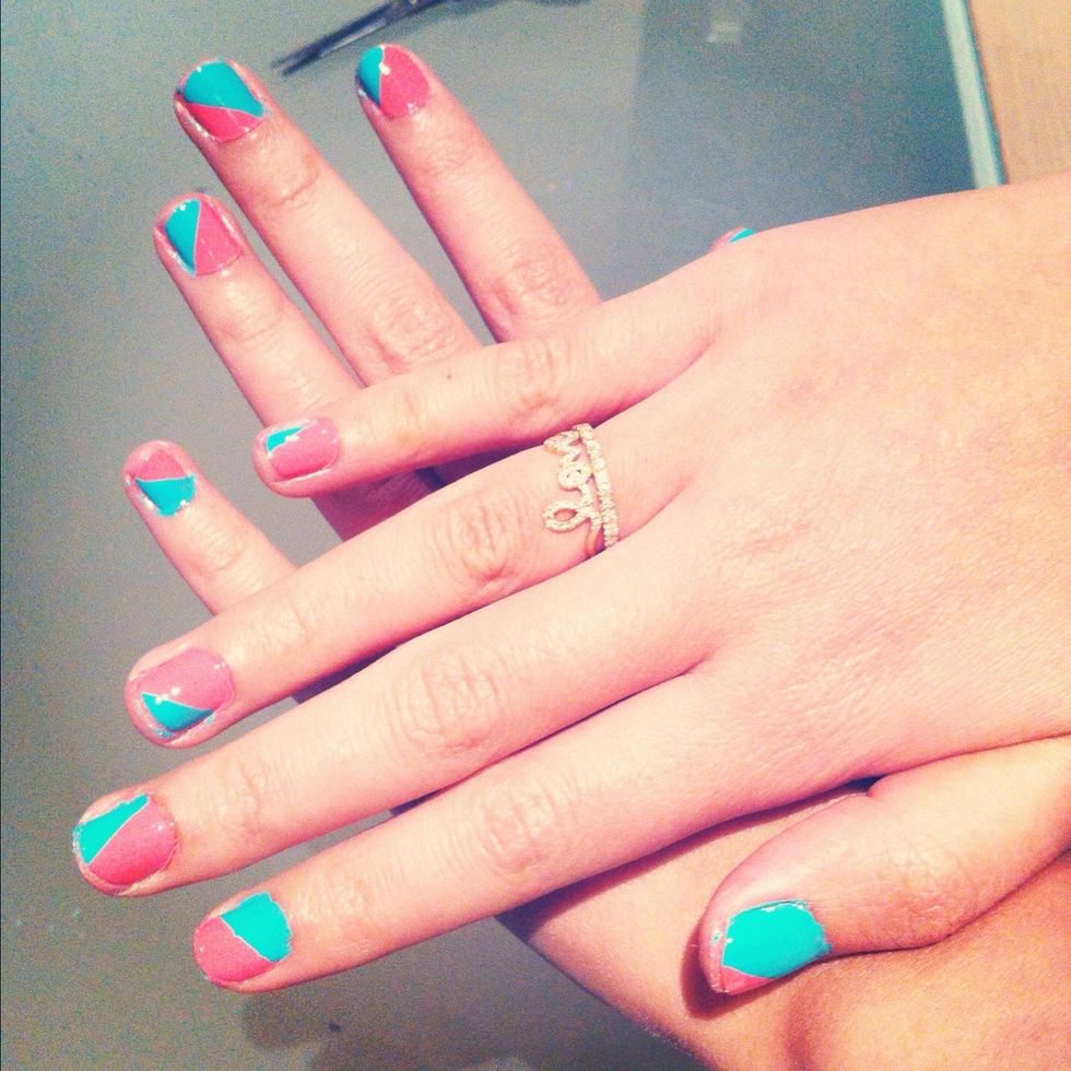 Apply it in the direction you want on the nail, press the edges well. Paint a THIN coat of the other colour (this is why you want the second colour to be darker) give it a second to dry