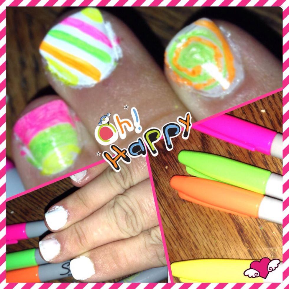Step 3- Draw designs on nails with Neon Sharpies. Go wild, have fun! Teens and kids can do each other's nails. This is great for parties, sleepovers, etc.