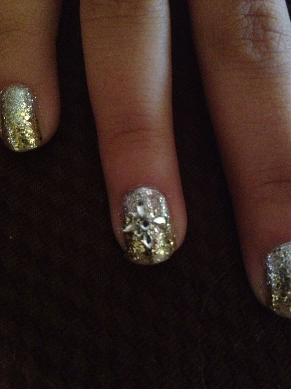 Step 5: Once silver glitter is dry, paint two coats on the top of the nail with the gold glitter nail polish