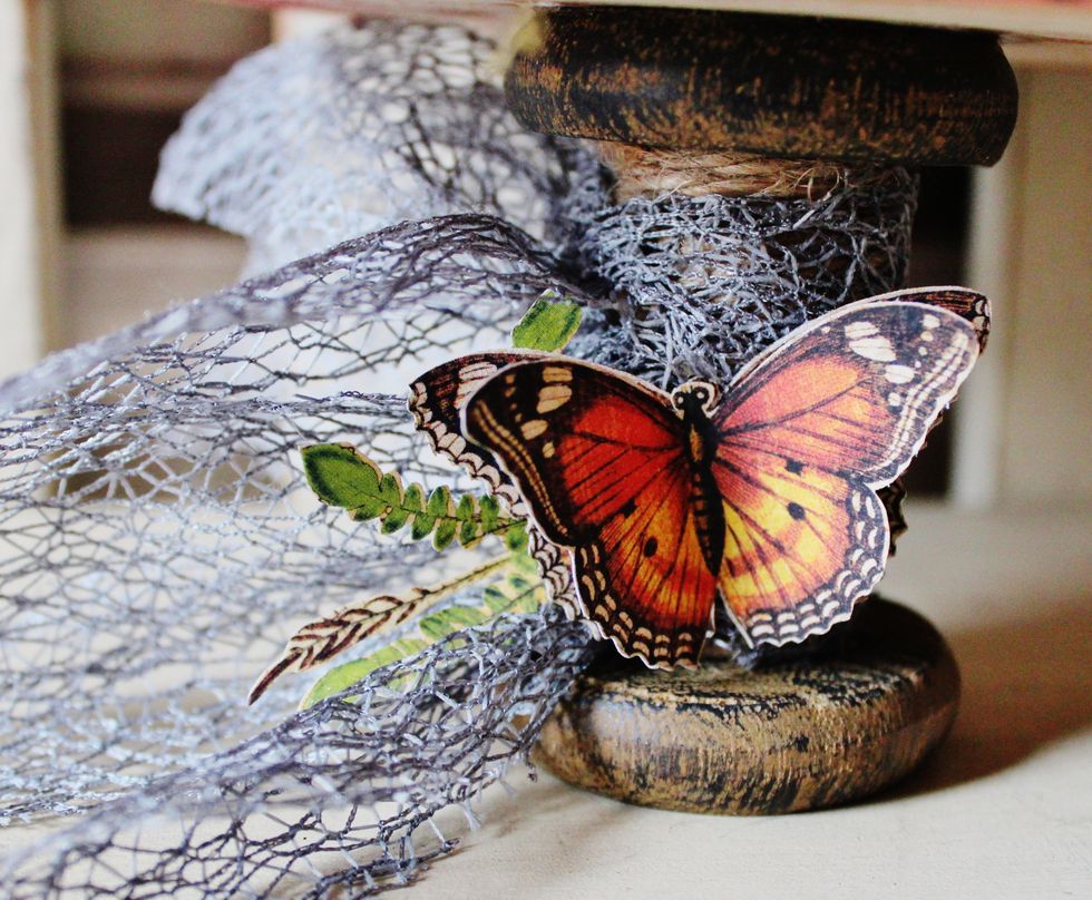 Add net bow to top of birdhouse with more prepared flowers and butterflies.
