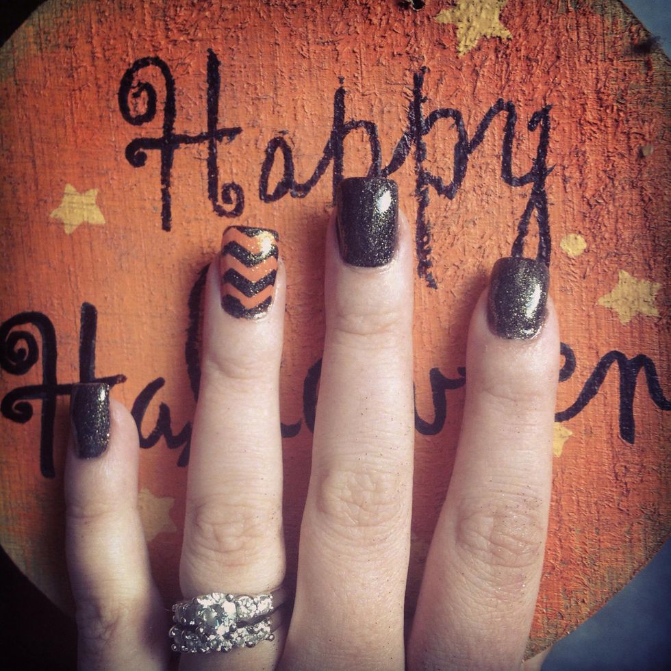 This step is optional: my orange nail polish did not have glitter in it like my black nail polish. I decided to add a clear polish with glitter over all nails!
