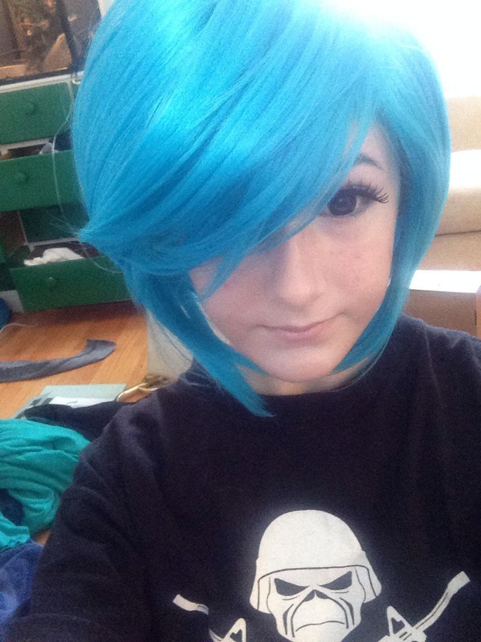 done! sorry I haven't shown you my face in the other steps... as you can see I have bad acne and I'm pretty self conscious... but I'm also wearing an electric blue wig heh