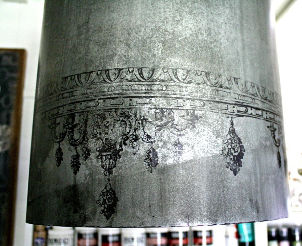 I have a LARGE amazing light in my craft room, but it was so unsightly! My honey made a metal cover "lamp shade" of sorts out of metal, but it was just too plain! Enter IOD's amazing Friffery Stamps.